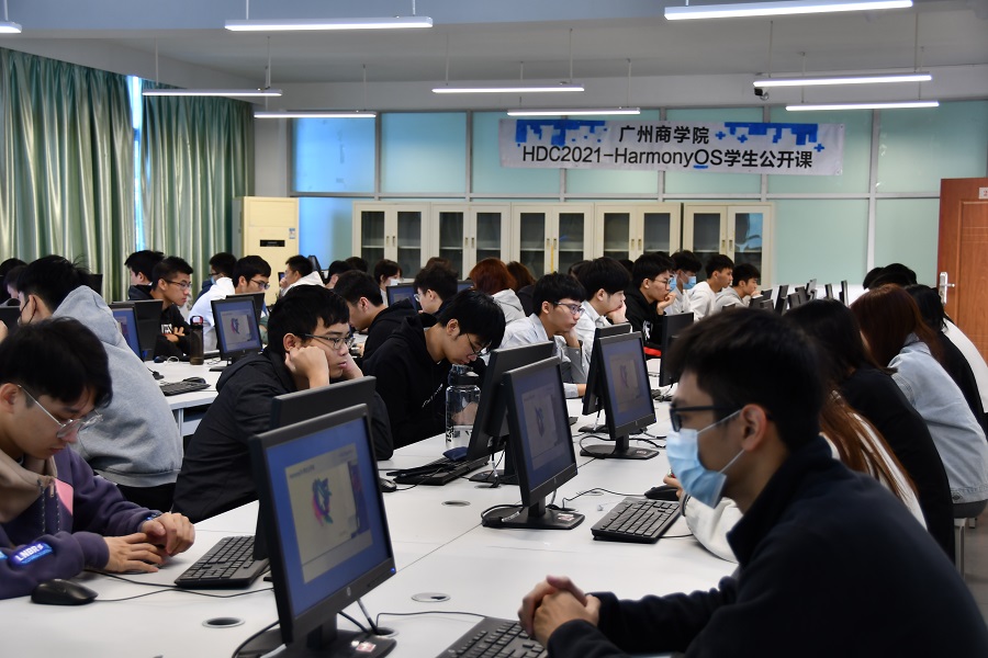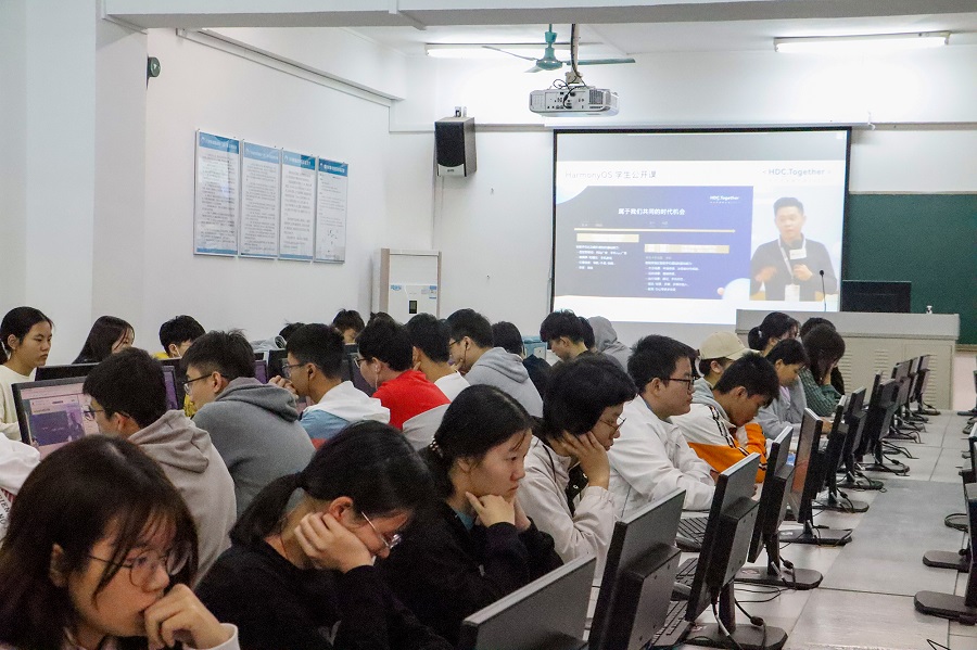 为了拓宽同学们的学术视野,让同学们了解鸿蒙最先进的技术,提升太阳成集团tyc33455的学术氛围。太阳成集团tyc33455于10月24日早上在实训楼203、204、208室参与HDC2021 HarmonyOS百校联动公开课直播课程。本场直播课由欧建深、马迪欣、张伟、张诏添主讲。