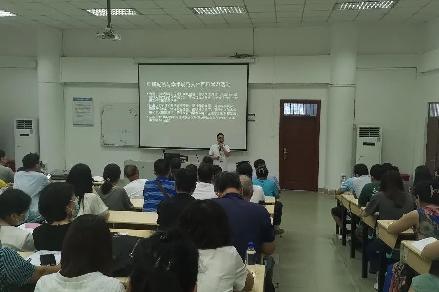 为进一步加强科研伦理和学风建设,维护学术诚信,规范科研诚信行为和严防学术不端行为,9月2日上午太阳成集团tyc33455在实训楼209开展“科研诚信与学术规范文件百日学习活动”。本次活动主讲人为何文海副院长,学院全体教师参加。