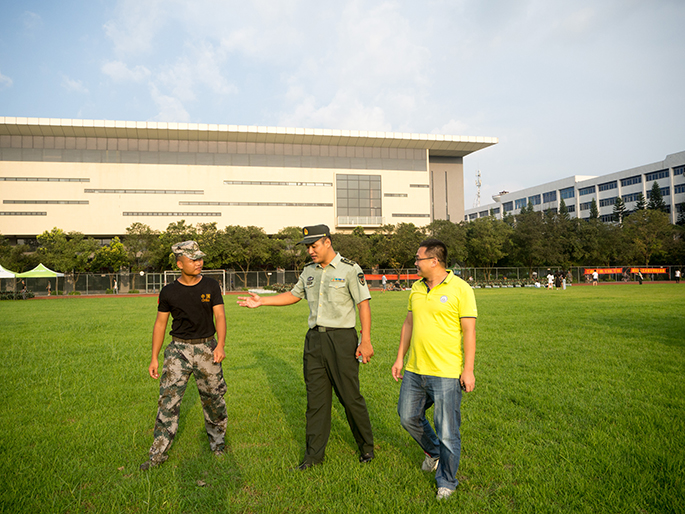 伴着激励士气的军歌,训练也接近尾声,教官们将新生分为两个阵营,为日后的军体拳训练及方阵训练做好准备。军训团团长陈甲也来到了我院新生的军训地点,他的关心与鼓励给新生们带来的不仅是温暖,更是一种无形的支持与力量。