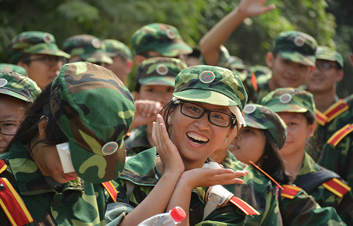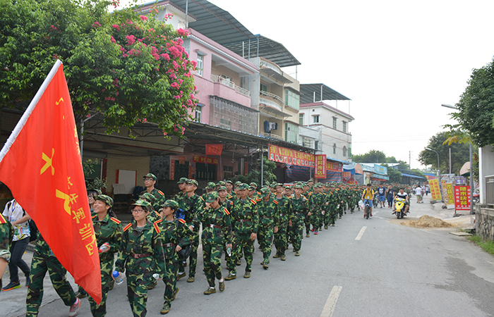 2015年9月19日早上8点03分,广州商学院2015级参训新生在广商田径运动场集合完毕后,伴随着军训团团长的一声令下,在校外旺村、洋田村等地展开了为期两个多小时的拉练项目。军训队伍似绿色长龙,穿行于风景旖旎的旺村、洋田村中;各院系那赤红色的旗帜,在风中猎猎招展。