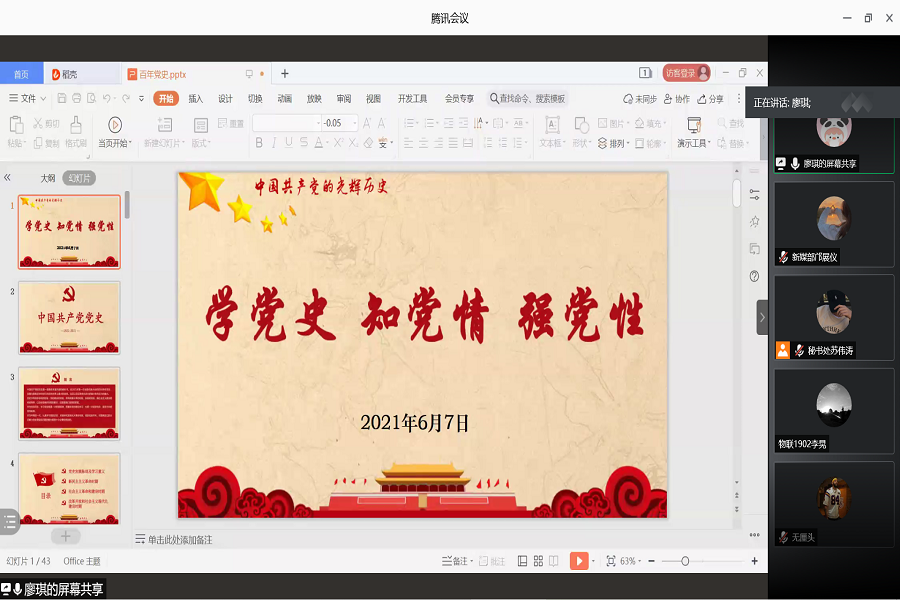 会议伊始,陈素婷与学生分享新中国史,系统地阐述了新中国诞生72年以来的风雨历程,讲解了中国发展过程中对于制度的探索与创新的艰辛历程,同时教育学生历史是最好的教科书,让国史之光照亮未来,以史为鉴、奋发向前,是当代青年实现中华民族伟大复兴的中国梦的重要使命。随后,廖琪跟学生分享“学党史,知党情,强党性”主题教育,通过建党百年讲述党史发展的三个历程:新民主主义革命时期、社会主义革命和建设时期、改革开放和社会主义现代化建设新时期,阐明了中国共产党是中国特色社会主义事业的坚强领导核心,并号召学生树立正确历史观,做到知史爱党、知史爱国,不断提升“四史”学习教育实效,在新时代发扬党的光荣传统、优良作风,以优异成绩向建党100周年献礼。