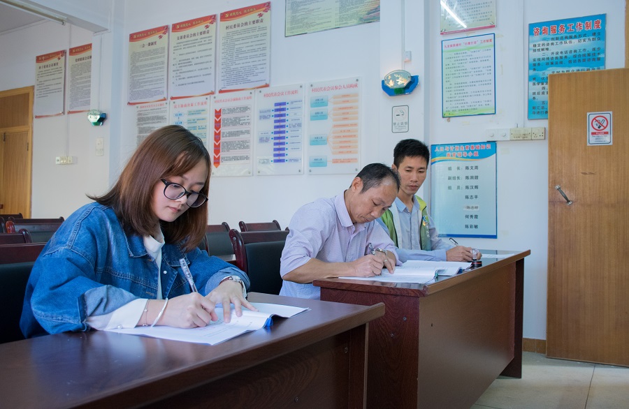e行动-志愿服务队一行于14日下午15时抵达燕塘村党群服务中心与陈文周、陈志平进行了简单的会谈。双方就如何创新志愿服务活动形式这一问题进行了深入的讨论,致力于以信院特色打造新颖的特色志愿服务活动,在交流探讨的同时,陈志平介绍了燕塘村的地理环境、人文素养、文化建设以及当前燕塘村志愿服务工作状况。通过此次简单的会谈,e行动-志愿服务队对燕塘村总体情况有了更加深入的认识,为今后各项志愿服务工作的开展奠定基础。随后,在陈柱华的主持下,黄丹琪与陈志平相互交换和审阅各项资料及协议,双方在认真审阅协议以及确认资料无误后进行签字,完成此次燕塘村志愿服务站点的挂牌仪式。