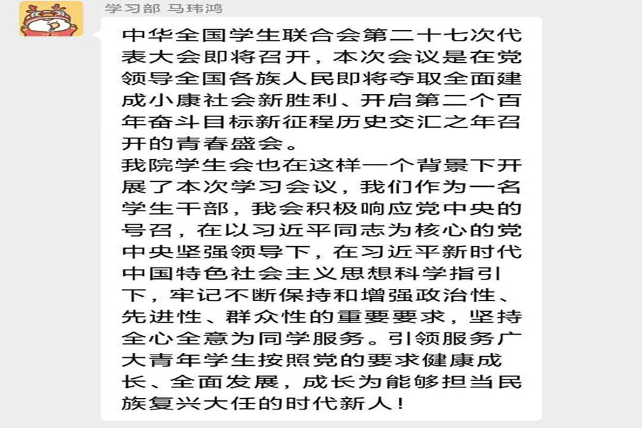 会议伊始,由学生会执行主席陈徽发表讲话,在发言中谈到,全国学生联合会第二十七次代表大会的召开,是党领导全国各族人民即将夺取全面建成小康社会新胜利、开启第二个百年奋斗目标新征程历史交汇之年的青春盛会。在习近平同志的指引下,各级学联组织应牢记政治性、先进性、群众性的重要要求。会议中,干部们纷纷发表感想,认为应要不断提高自身实力,沿用习近平新时代中国特色社会主义思想武装头脑,持续坚定中国特色社会主义信念,以此更好地推进习近平新时代中国特色社会主义思想事业的爱国奋斗精神,向实现人生理想和价值迈进。经过全国各族人民团结奋斗,我们即将踏上实现第二个百年奋斗目标进军的新征程。在更加注重以文化育人的同时,广泛开展形式多样、健康向上、格调高雅的校园文化活动和各类社会实践。习近平总书记的谆谆教诲,为学联学生会更好地履行职责与使命,增强工作的文化蕴涵,为服务校园文化建设指明了方向。