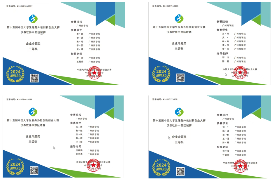 获2024年第十五届中国大学生服务外包创新创业大赛中部区域赛三等奖4项
