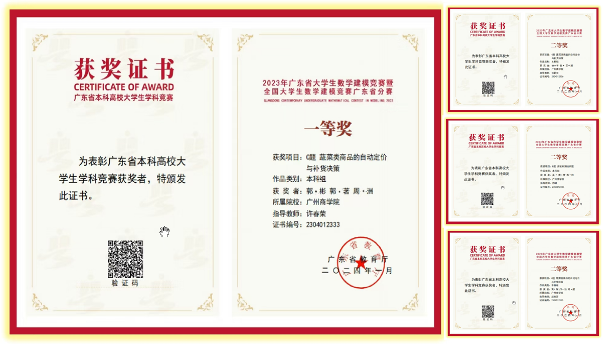 获2023年全国大学生数学建模竞赛广东省一等奖1项,二等奖3项和三等奖8项